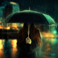 dark clothing and holds an umbrella to shield herself from the downpour. The background suggests it might be