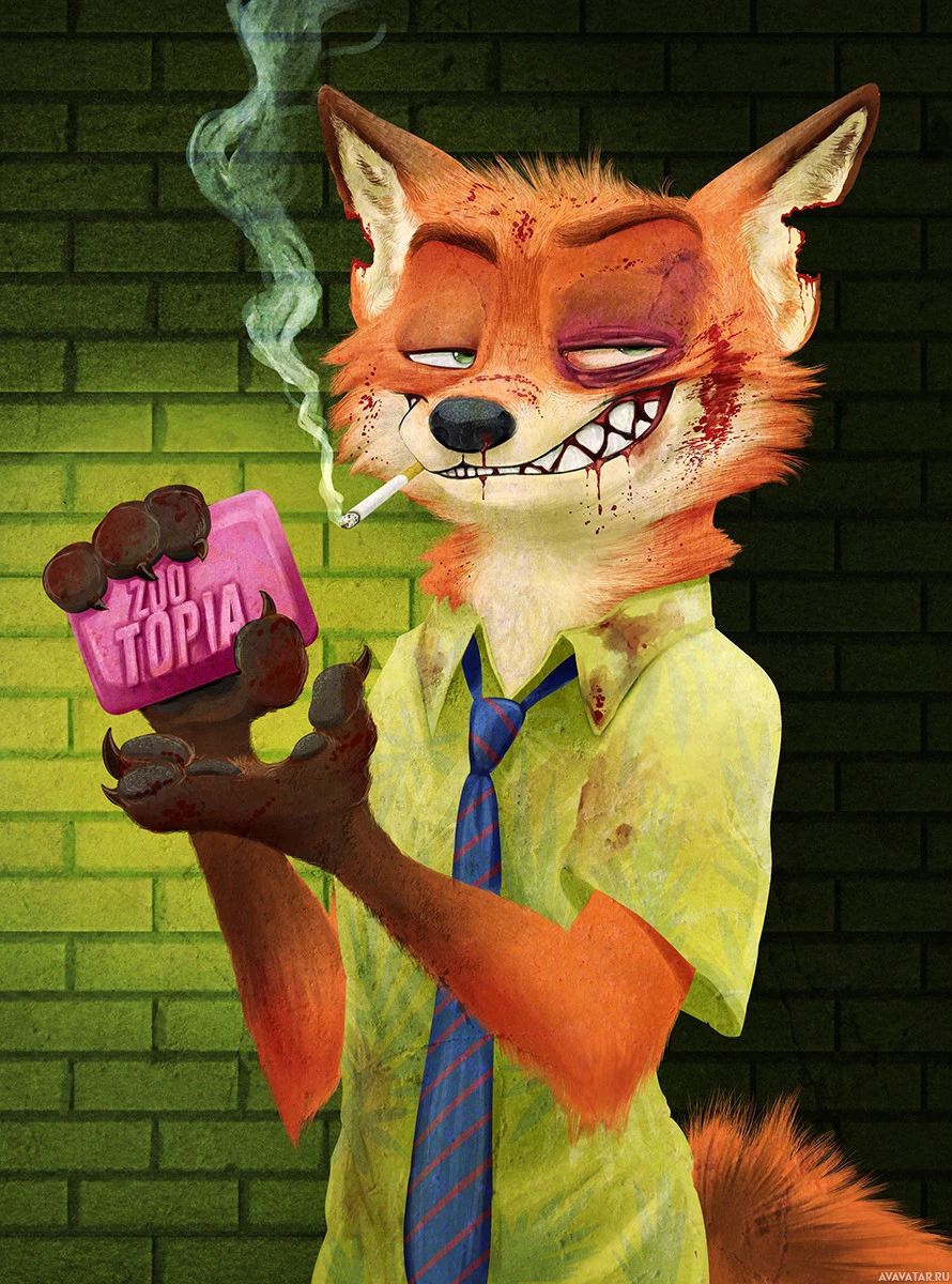 an animated movie. The fox has a somewhat disheveled appearance with a cigarette in its mouth and is holding up what seems to be a package of cigarettes. It's wearing
