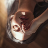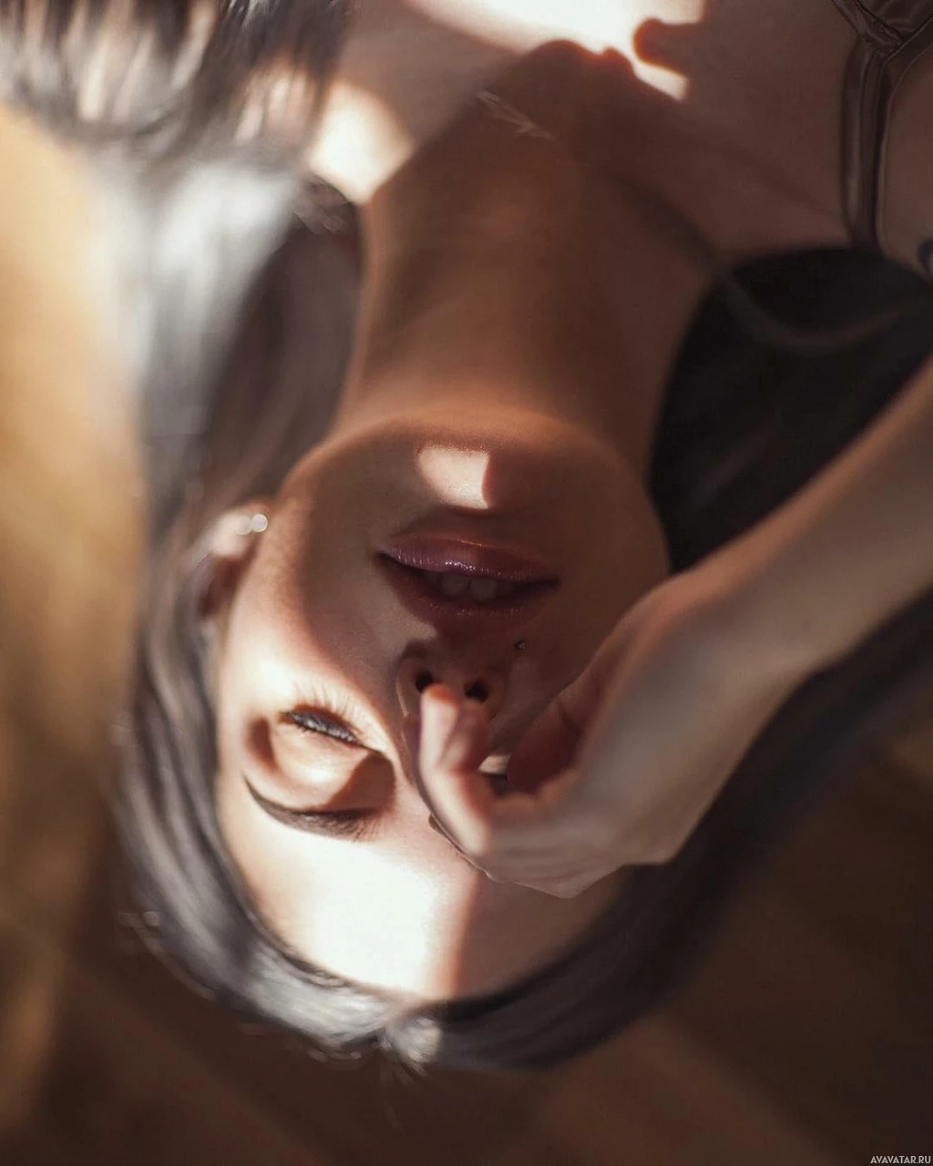 a relaxed state, possibly enjoying the warmth of sunlight or a warm room on her face and neck. Her hair is dark, and she has