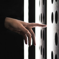 The image shows a close-up of a person's hand, with their fingers reaching out towards a wall or panel covered in small circles. It appears that the person is interacting with the panel, possibly using touch to control or manipulate an electronic device or interface.