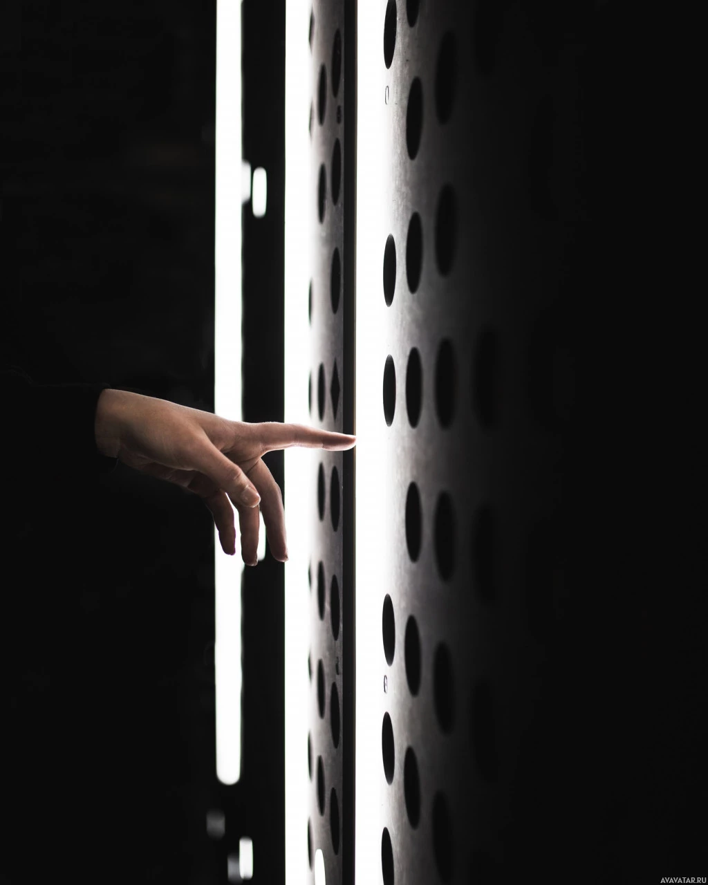 Картинка показывает крупный план руки человека, пальцы которого тянутся к стене или панели, покрытой небольшими кругами. Похоже, что человек взаимодействует с панелью, возможно, используя прикосновение для управления электронным устройством или интерфейсом.