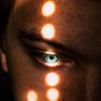 Это портрет человека с частично затененным солнечным светом лицом, сияющим сквозь объект, напоминающий жалюзи или решетки. У человека голубые глаза и светлая кожа, а свет создает интересные узоры на лице из-за тени.