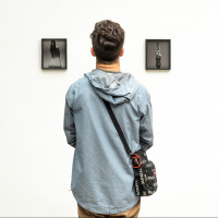 The image shows a person standing with their back to the camera, facing an art exhibition wall. There are several framed pictures displayed on the wall in front of them, and it appears that this individual is observing or contemplating the artwork. The person is wearing