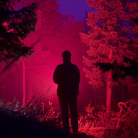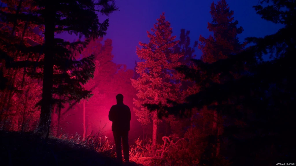 a forest at night. The person is silhouetted against the backdrop of trees and foliage, creating