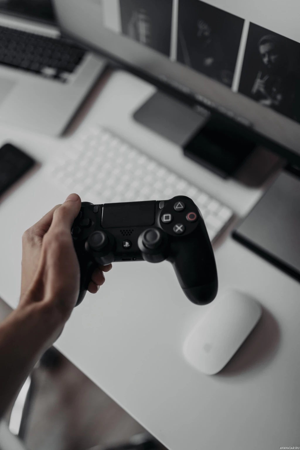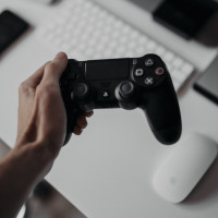 the game controller rather than any specific games or elements of the environment, which include a computer monitor and various other peripherals and devices like keyboards and mice on the desk.