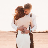 The picture shows a man and a woman embracing each other in a beach setting during what appears to be either sunrise or sunset given