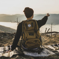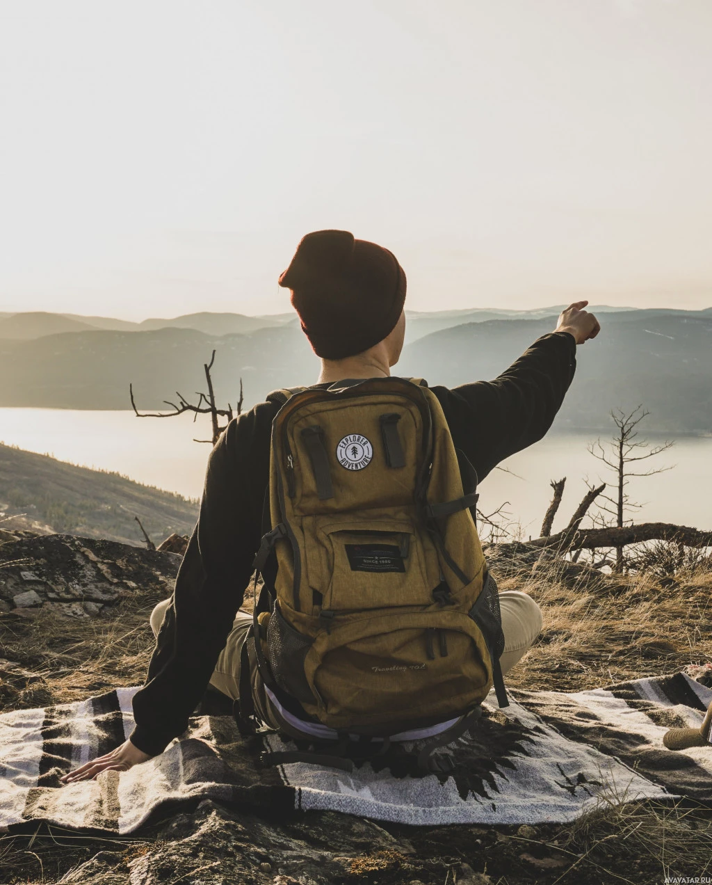 The image shows a person sitting on the ground with their arms raised, appearing to be celebrating or expressing joy. They are wearing a backpack and are located in