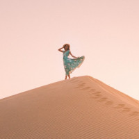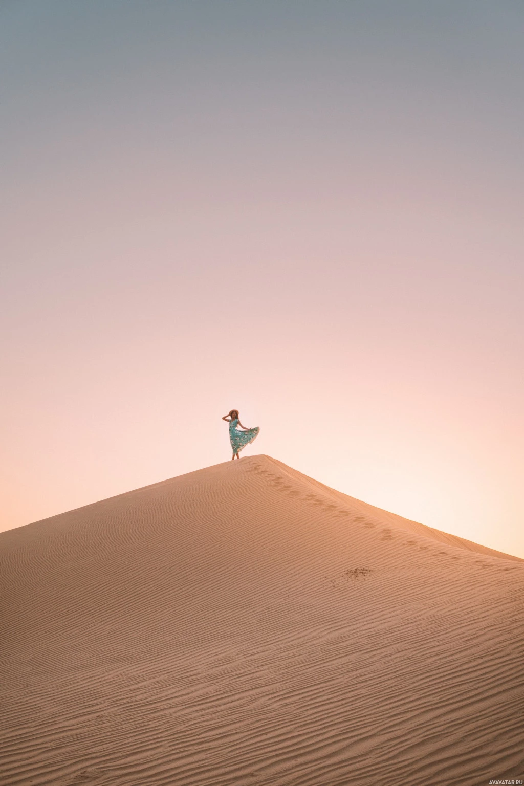 На картинке изображен человек, стоящий на вершине песчаной дюны. Этот человек носит платье, и кажется, что это либо восход солнца, либо закат, учитывая теплые оттенки в небе. Пейзаж вокруг них предполагает, что они находятся в пустыне.
