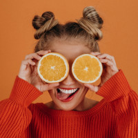 a funny game or challenge. The background is solid in color, which suggests that it might have been chosen for its contrast with the subject, highlighting her and the oranges.