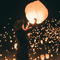 The image shows a person standing in front of numerous floating lanterns. From behind, the individual appears to be wearing a hat and holding what looks like a lantern with an open flame at its base. It's a captivating scene that seems to capture a moment of serenity or celebration with the glowing lights in the dark sky.