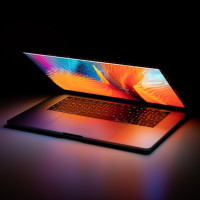 The image shows a laptop with its keyboard and trackpad visible. It appears to be a modern, possibly high-end device, indicated by the design features such as the thin profile and the colorful
