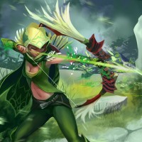 The image depicts a character from the game Dota 2, known as Windranger. She is shown in an action pose with her bow drawn back and ready to fire, surrounded by nature elements like grass and trees, which suggests she might be in a forest setting typical of the game's environment. The character is wearing green and white armor that matches the color scheme of Windranger's appearance in the game.