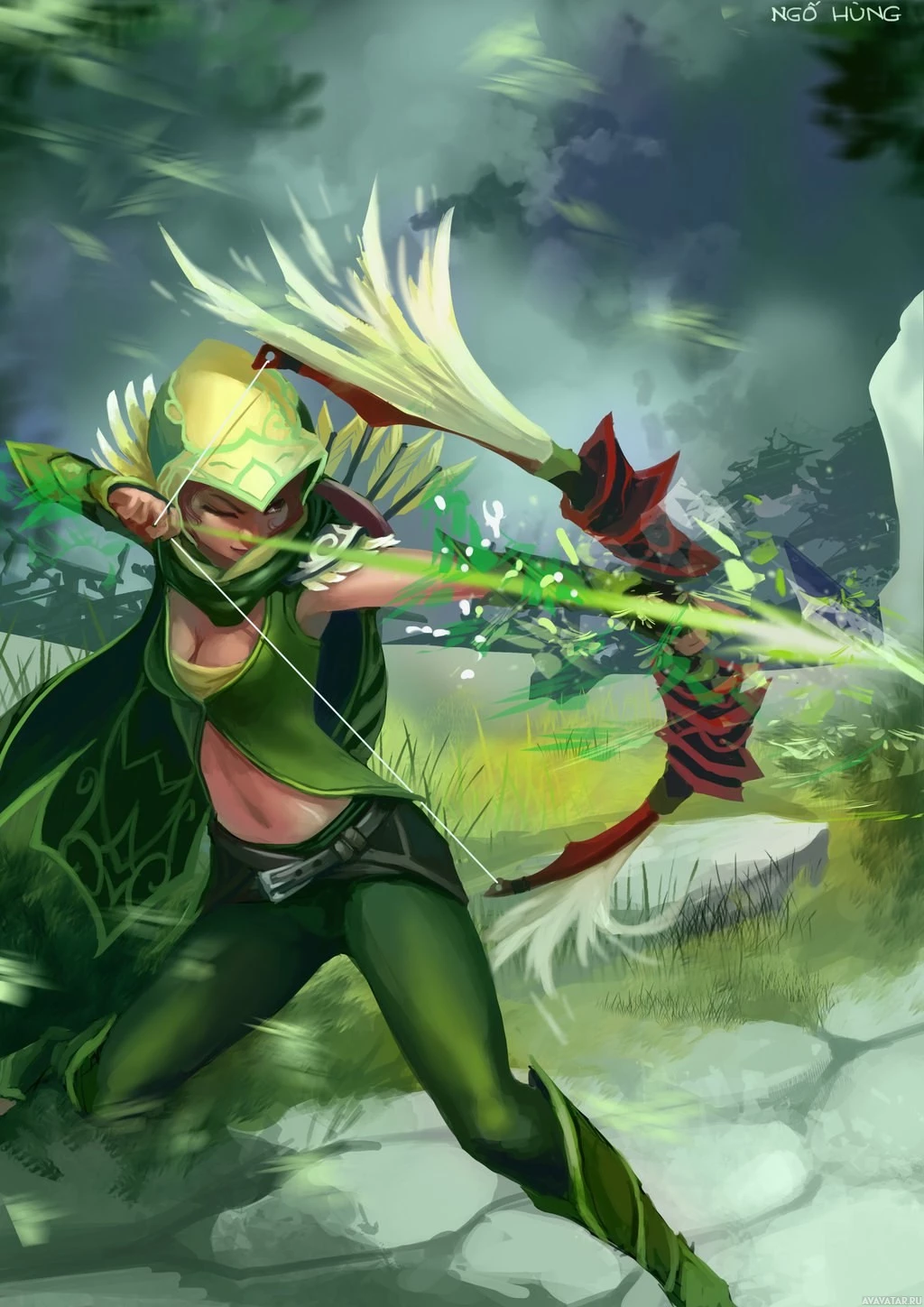 На картинке изображен персонаж из игры Dota 2, известный как Виндрангер. Она показана в боевой позе с луком, оттянутым назад и готовым к огню, в окружении природных элементов, таких как трава и деревья, что предполагает, что она может быть в лесной обстановке, типичной для окружающей среды игры. Персонаж носит зелёную и белую броню, которая соответствует цветовой схеме появления Виндрейнджера в игре.