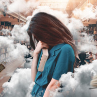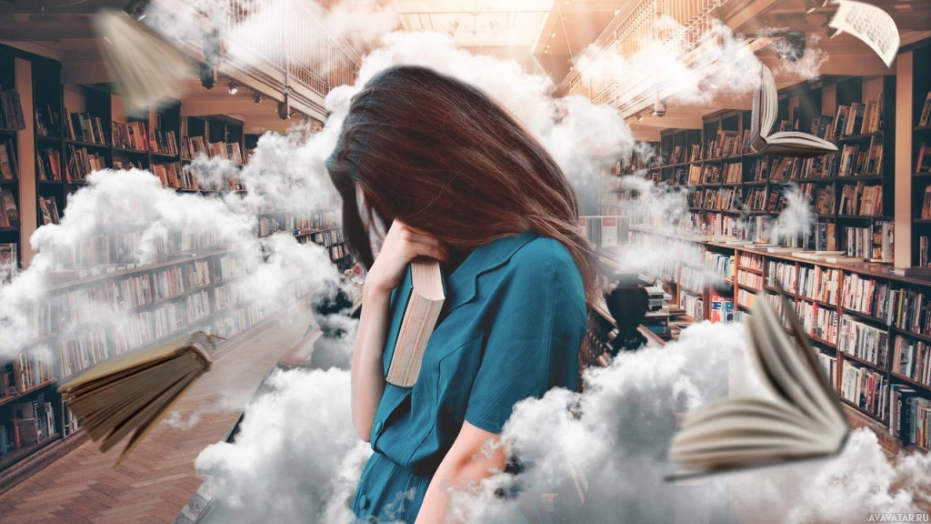a cloud of smoke or fog that appears to be made up of book pages. The scene conveys a sense of being immersed in reading and knowledge, with the smoke or fog possibly symbolizing the escape into