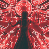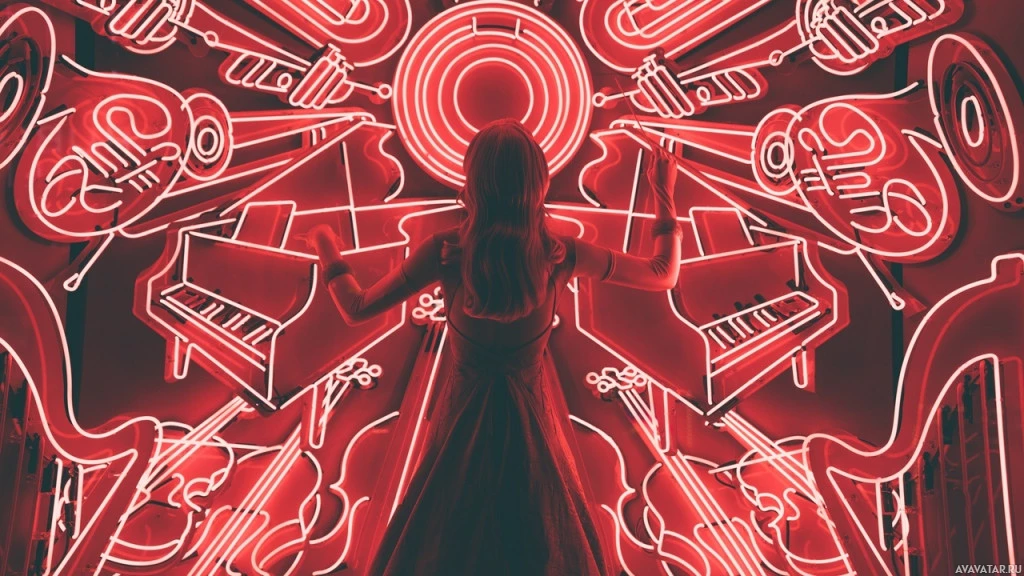 На картинке изображен человек, стоящий за большим освещенным дисплеем с красными неоновыми огнями в форме музыкальных инструментов и нот. Человек взаимодействует с дисплеем, возможно, исполняя или создавая музыку. Сеттинг имеет современную, художественную атмосферу.