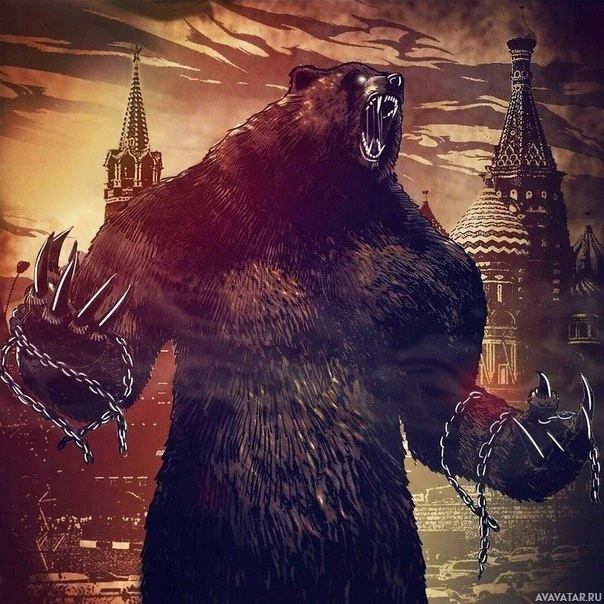 a comic book or graphic novel cover. The bear is depicted with exaggerated features and is set against a cityscape that resembles Moscow's architecture, which includes well-known landmarks like St. Basil's Cathedral. The bear has