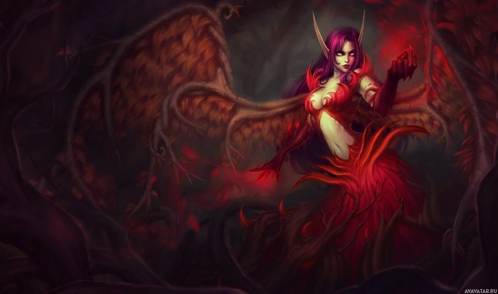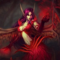 a red outfit, which contributes to her demonic appearance. The background suggests a dark,