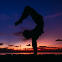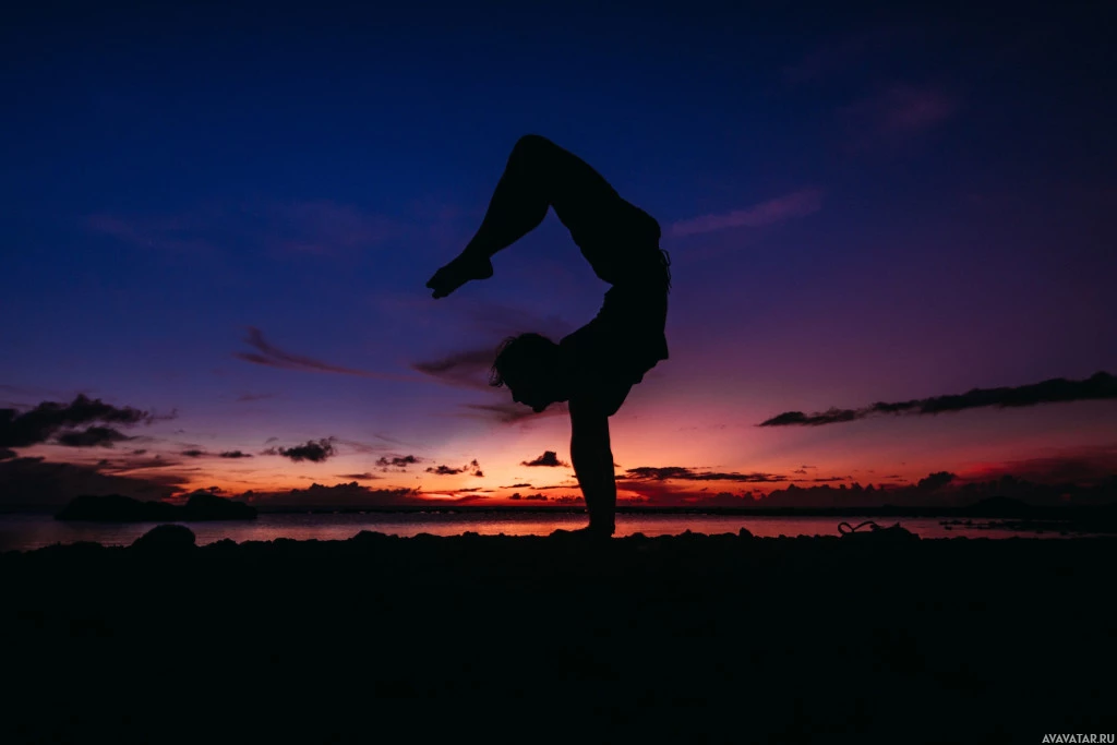 На картине изображен силуэт человека, выполняющего позу йоги. Фон показывает красивый закат или восход солнца с теплыми оттенками оранжевого, розового и фиолетового в небе. Изображение также имеет отражения на поверхности воды внизу, создавая безмятежную и успокаивающую атмосферу.
