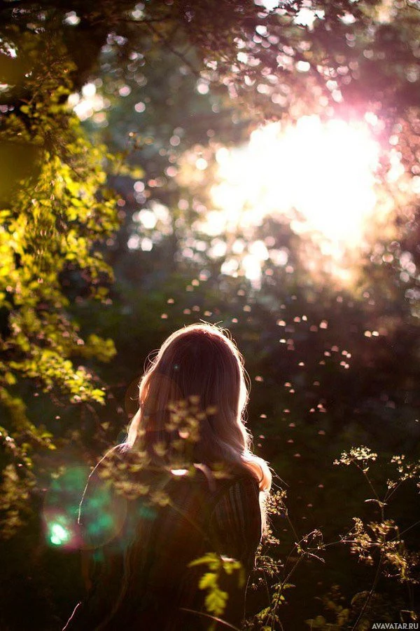 blonde hair standing in a forested area. The sunlight filters through the trees above her, creating a warm and serene atmosphere. There are also some beams of light shining down on her from above, adding to the overall peaceful
