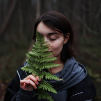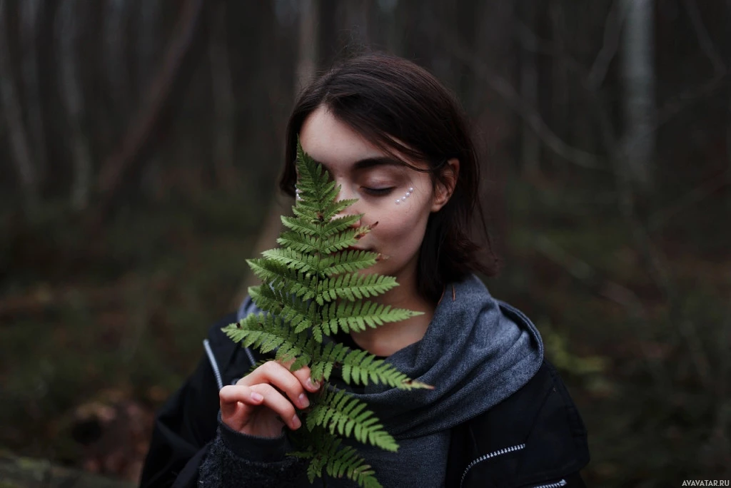 brunette hair and is holding a fern-like plant near her nose, smelling it. She is dressed in what looks like casual