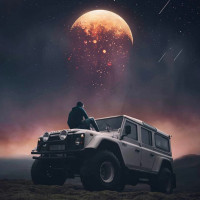 type car, with robust design elements like large headlights and a sturdy chassis typical of such vehicles. The scene is quite tranquil, possibly set on a desert plain or in a remote location given