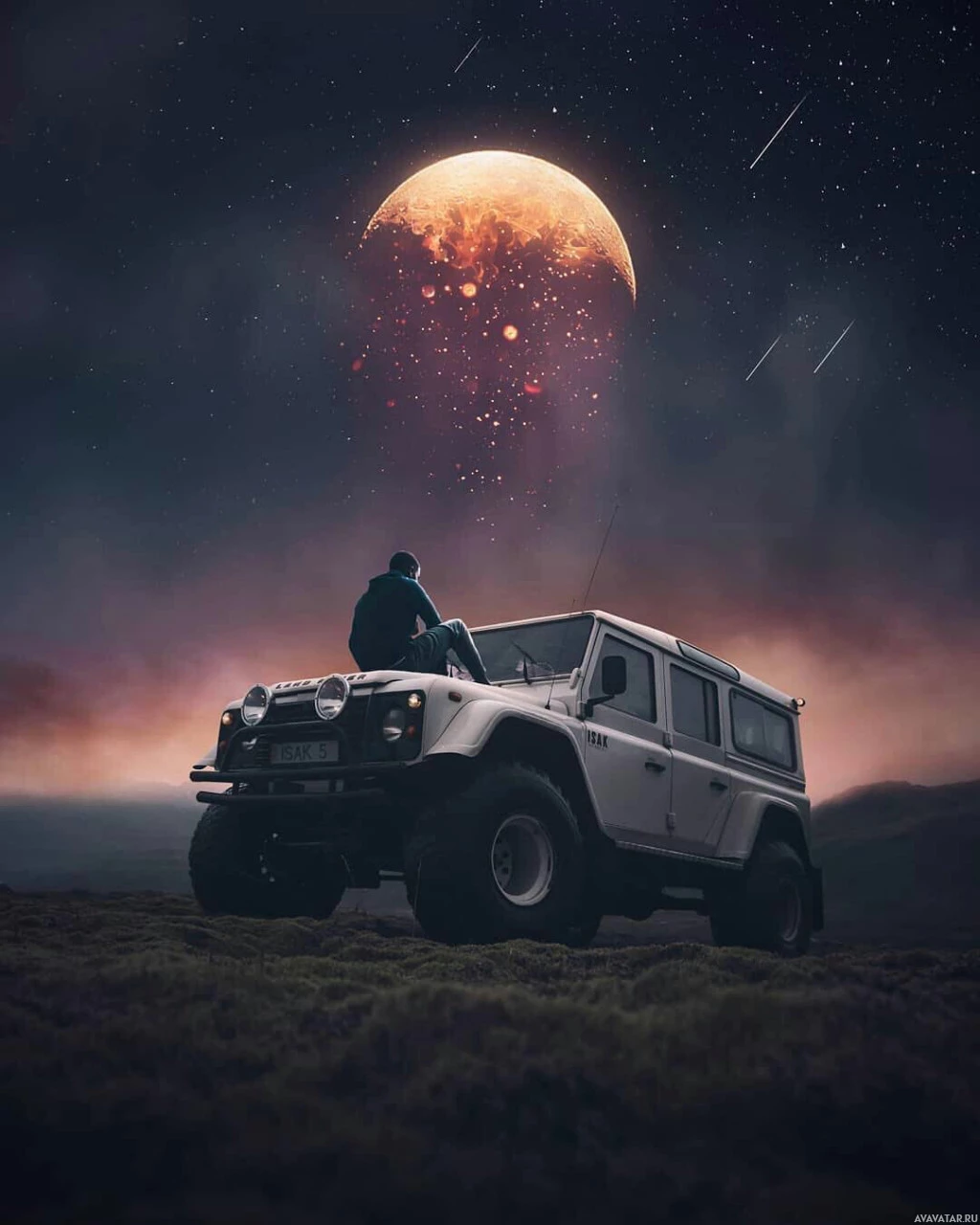 a large moon illuminating the surroundings and casting light on the landscape below. There are also stars visible in the sky, suggesting it might be late evening or