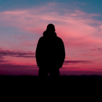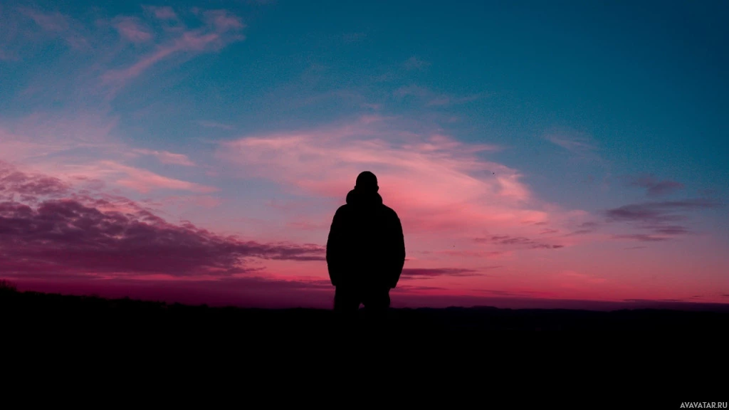 a silhouette of a person standing at the edge of what appears to be a hill or ridge. They are facing away from the camera, towards the horizon where there is a beautiful pinkish-