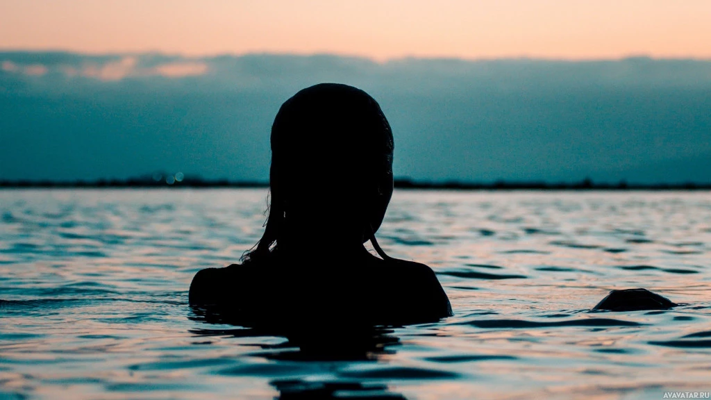The image shows a silhouette of a person, likely a girl or woman, sitting in water at what appears to be either sunrise or sunset. The sky is painted with