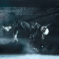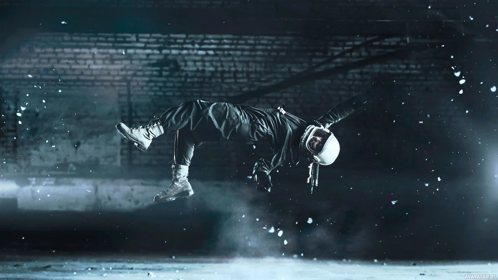 an action pose, seemingly falling or diving headfirst into a pool of water. They are wearing a helmet and appear to be in a dynamic motion that suggests movement at