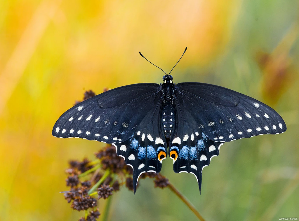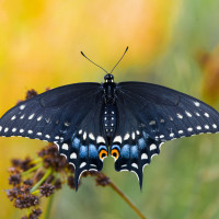 an adult butterfly, characterized by its vivid wings with a pattern of blue, orange, and black coloration. The butterfly is likely a species of the Monarch group or another butterfly known for its large wingspan and