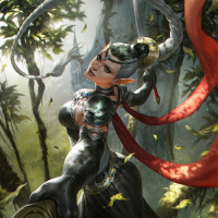 The image features a character depicted in a fantasy-themed artwork. The character appears to be an elf, with