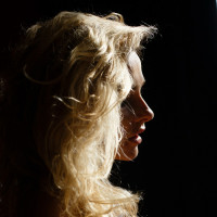 blonde hair, looking to her left. She appears to be indoors, possibly in a room with a window or an opening that provides