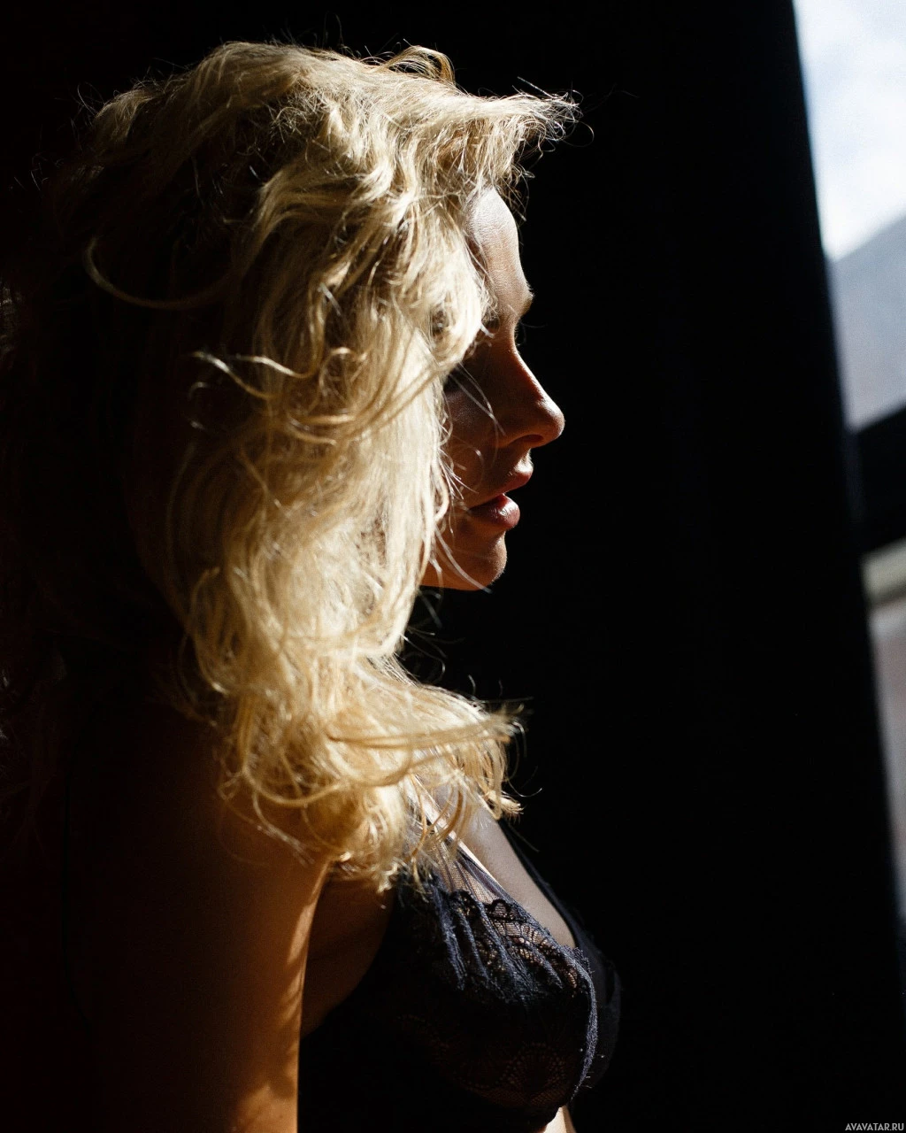 natural light and creates a soft glow on her face. The woman is wearing lingerie and there's