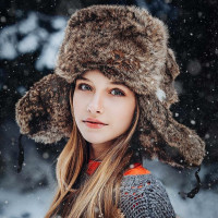 На картине изображена молодая девушка в меховой шляпе. Она смотрит прямо в камеру с тонкой улыбкой на лице. Фон предполагает, что это может быть снежный день из-за белых пятен, которые могут указывать на падающий снег или снежинки в воздухе.