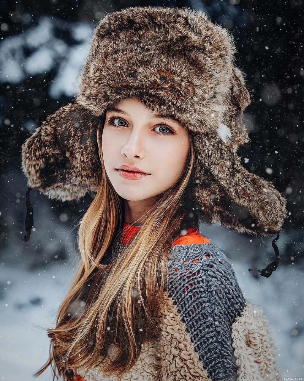 In the picture, there is a young girl wearing a fur-lined hat. She is looking directly at the camera with a subtle smile on her face. The background suggests it might be a snowy day due to the white specks that could indicate falling snow or snowflakes in the air.