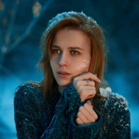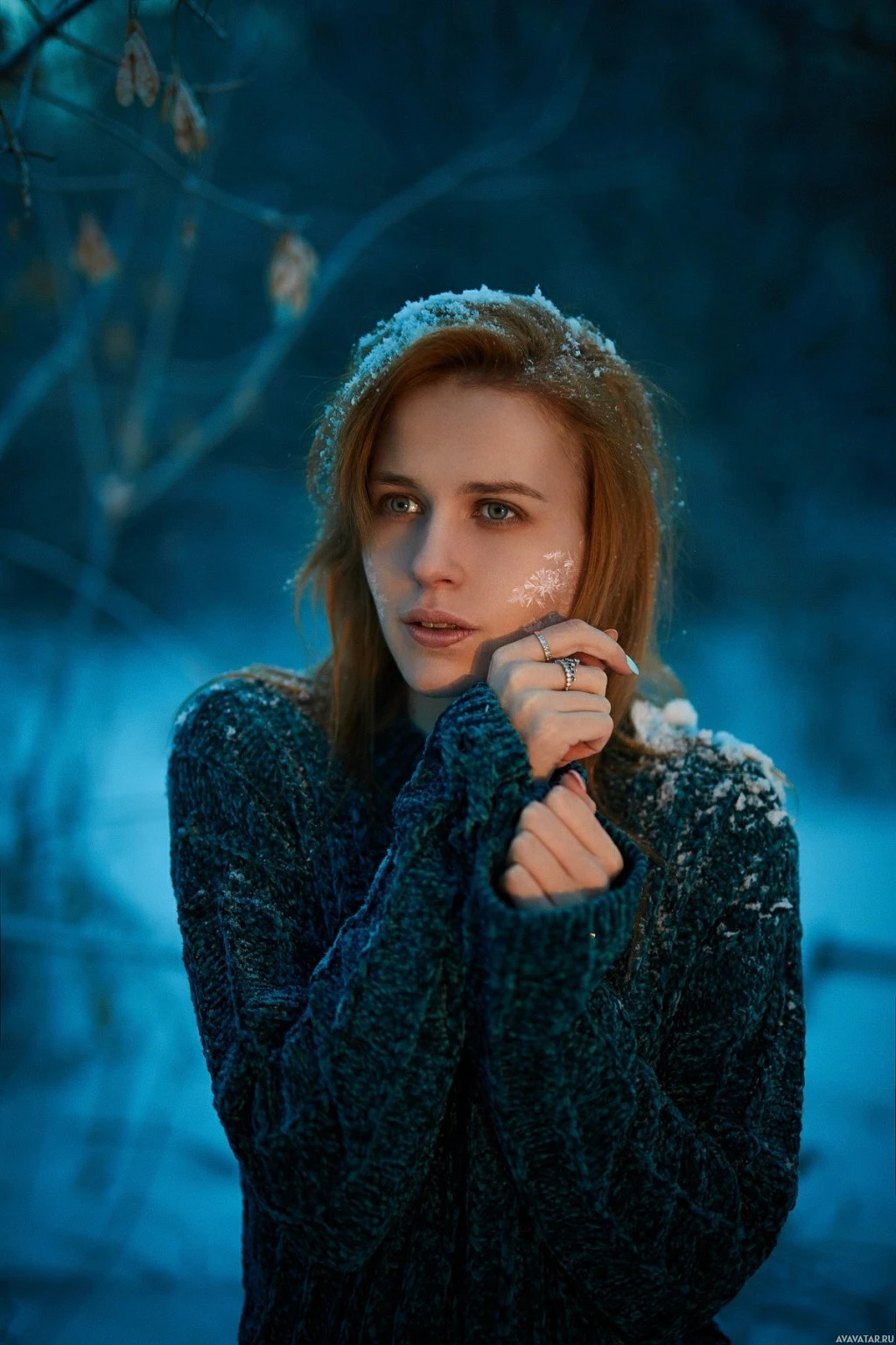 a young woman with red hair, who appears to be shivering or feeling cold. She's wearing a dark-colored top and is hugging herself with her hands crossed over her torso, suggesting she might be in the snow or during