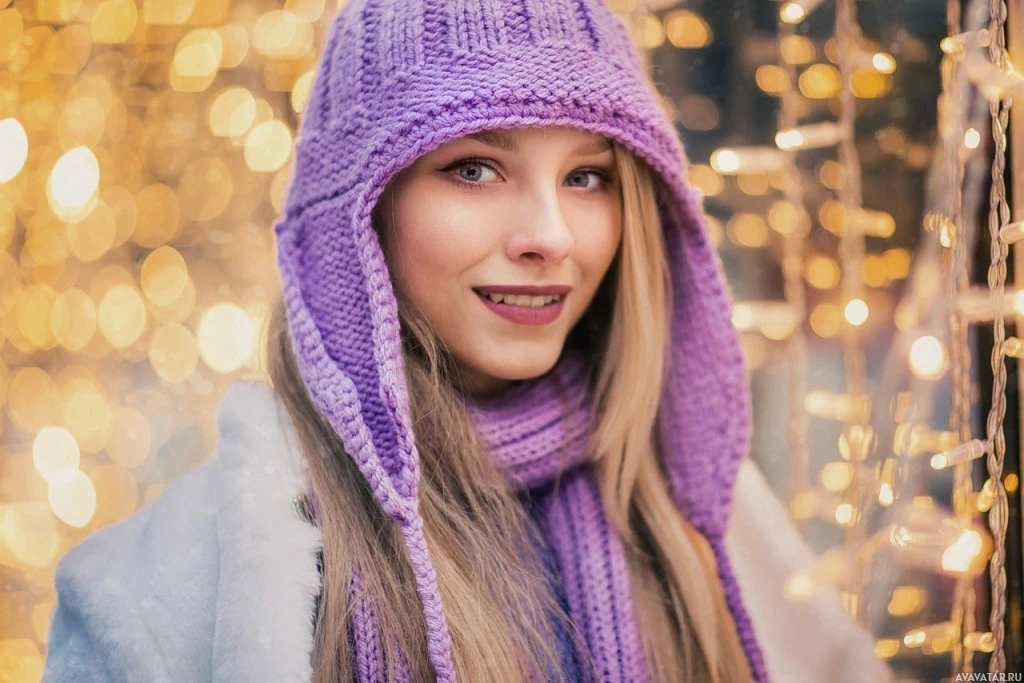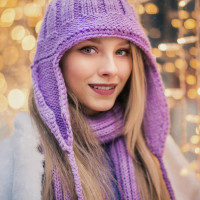 blonde hair smiling at the camera. She is wearing a purple knit hat and scarf, suggesting it might be cold outside or she's dressed for