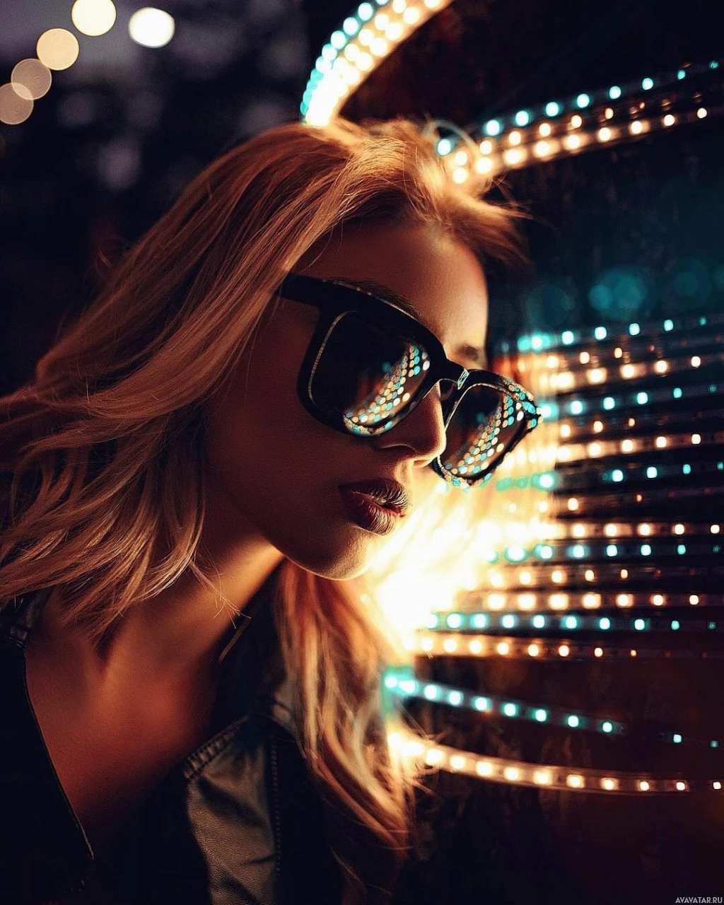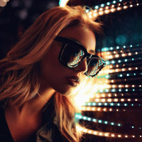 На картинке изображена женщина со светлыми волосами. Она носит большие круглые солнцезащитные очки и ее взгляд направлен в сторону. За ней — освещенный круговой световой эффект, создающий визуально интересный фон.