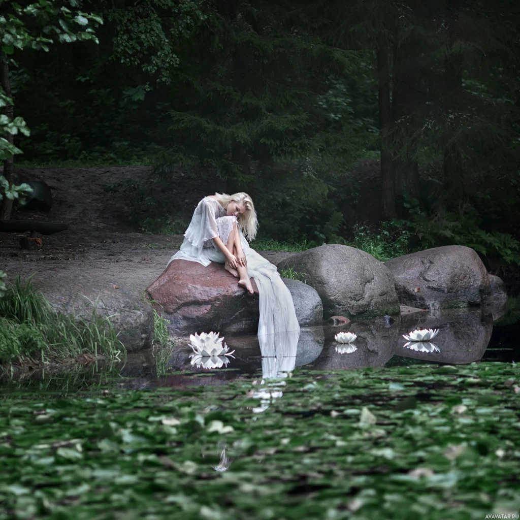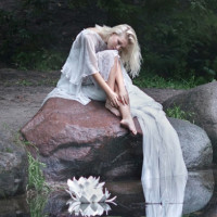 The picture shows a person sitting on rocks near the edge of a body of water, which appears to be a lake or pond. The individual is wearing a long dress and has blonde hair. There are flowers blooming in the foreground, contributing to a serene atmosphere. The reflection of the person is visible on the water's surface.