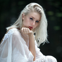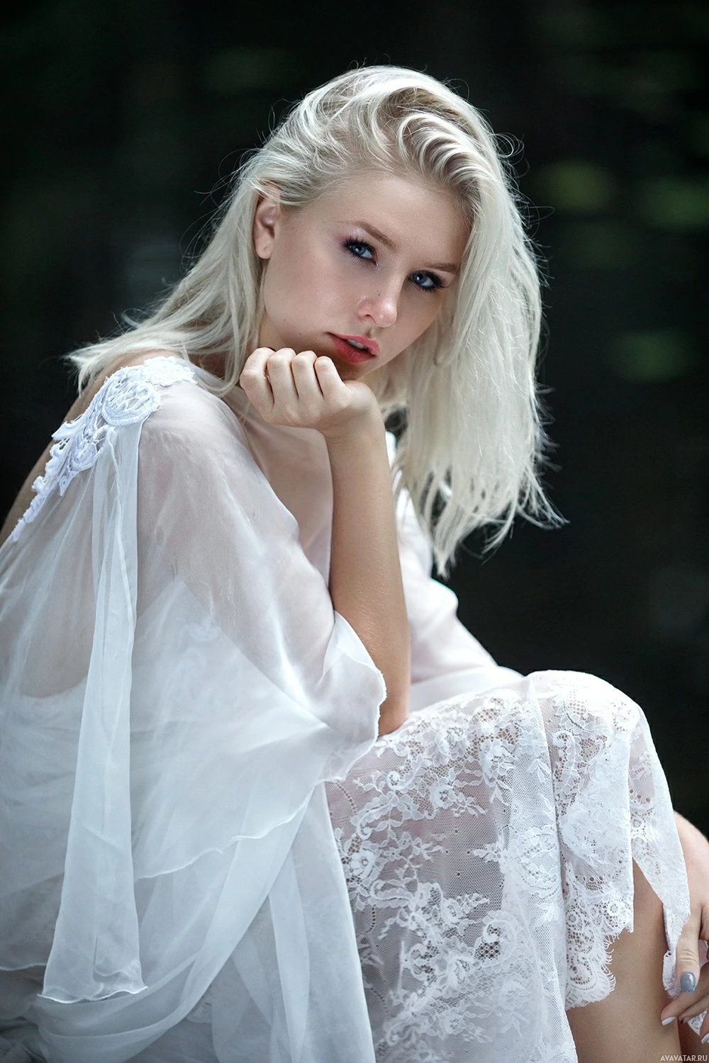 На картинке изображена молодая женщина с светлыми волосами, сидящая на том, что кажется пеньком или бревном. Она одета в белое кружевное платье, которое элегантно одето вокруг нее. Ее поза и выражение лица предполагают момент созерцания или, возможно, ожидания кого-то. Фон мягко размыт, что указывает на то, что это может быть естественная наружная обстановка с деревьями или листвой.