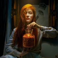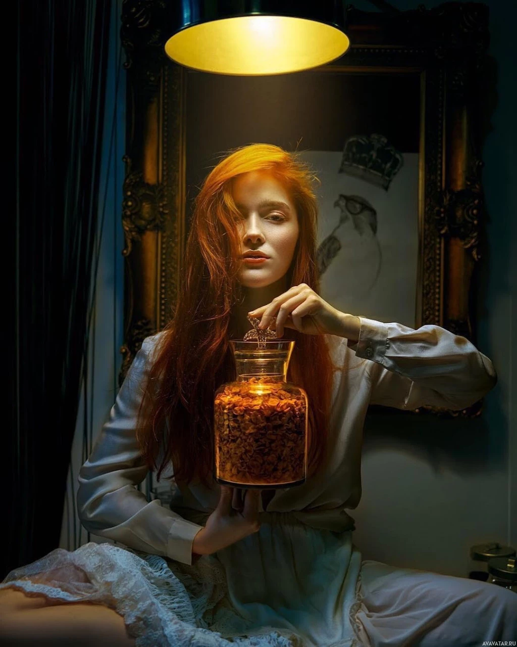red hair, holding what appears to be a jar of cookies or some other small items. They are sitting in