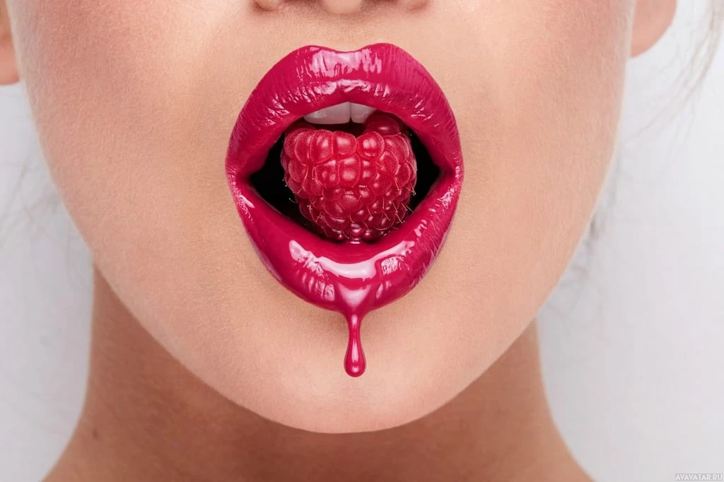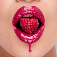 The image shows a close-up of a person's face with lips partially open, as if they are about to take a bite or have just taken a bite from a raspberry. The focus is on the lips and the berry, which could be related to themes such as