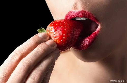На картинке изображен крупный план женщины, кусающей красную клубнику. Она, кажется, наслаждается фруктами, и ее губы слегка расставлены, когда она кусает.