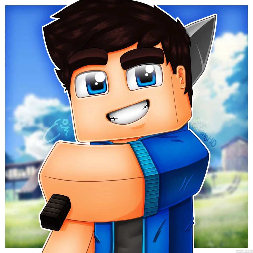 an illustrated character that resembles a Minecraft player. The character is smiling and holding what appears to be a sword in its right hand, suggesting it may be a warrior or adventurer within the Minecraft