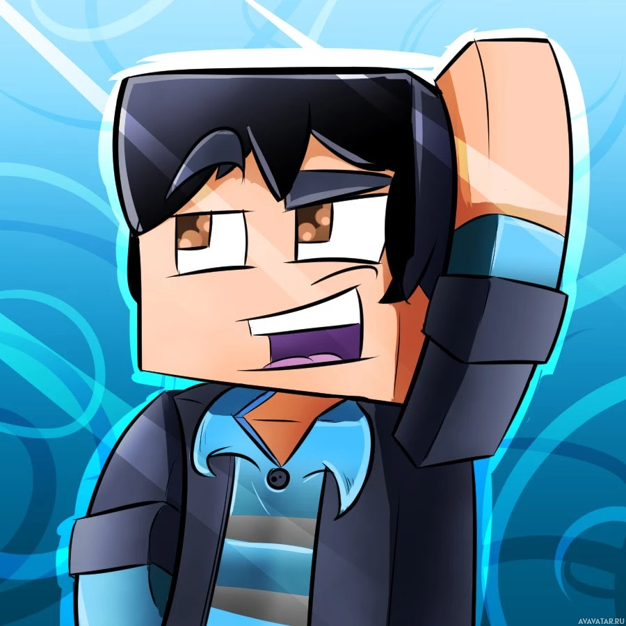 На картинке изображен анимированный персонаж, напоминающий игрока Minecraft, с удивленным или взволнованным выражением лица. Этот персонаж является стилизованной версией типичных аватаров, используемых в игре, и он стоит на фоне синего и зеленого цветов с абстрактными закрученными узорами.
