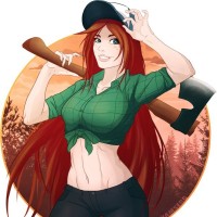 red hair and is wearing a green shirt with a plaid pattern, a baseball cap backwards on her head, jeans, and boots. In one hand, she's holding an axe over her shoulder, suggesting a rustic or outdoor setting. The background shows a forest-like