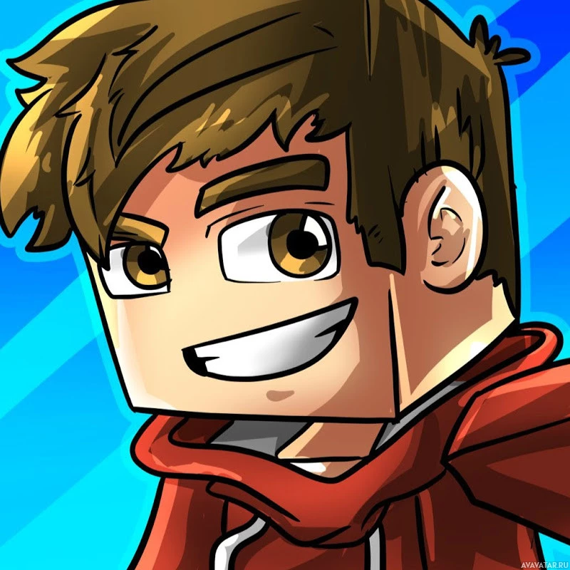 На картинке изображен персонаж в мультяшном стиле, напоминающий персонажей из игры «Minecraft». Персонаж имеет каштановые волосы и носит красную куртку, улыбаясь зрителю. Фон простой синий с некоторыми неоновыми зелеными акцентами.