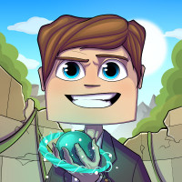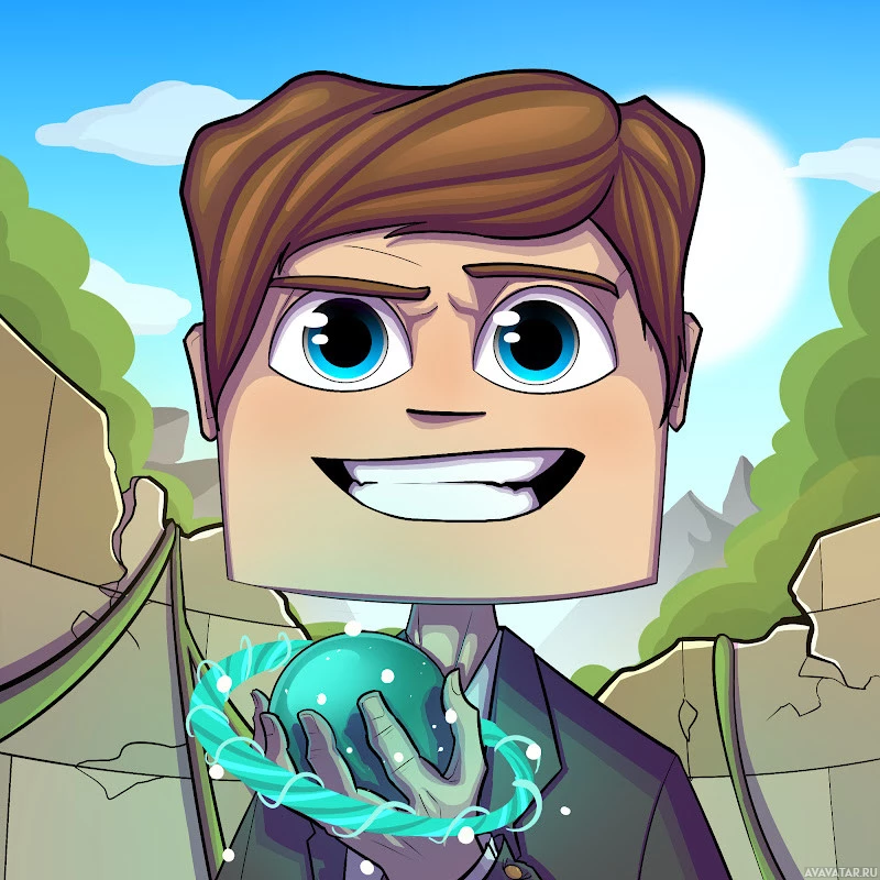 blue eyes, is smiling broadly, and appears to be holding what looks like a Minecraft-themed object that could be related to gameplay or crafting. The background suggests