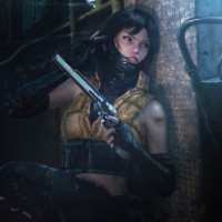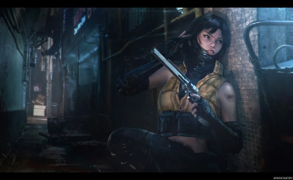 a female character holding a pistol. She appears to be in