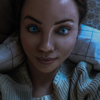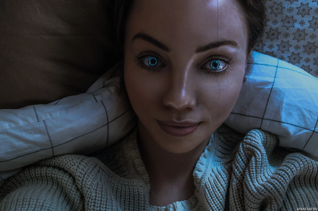 blue glow to them, which might suggest that she is portraying a character or using special effects makeup to create an unnatural appearance. This gives the picture